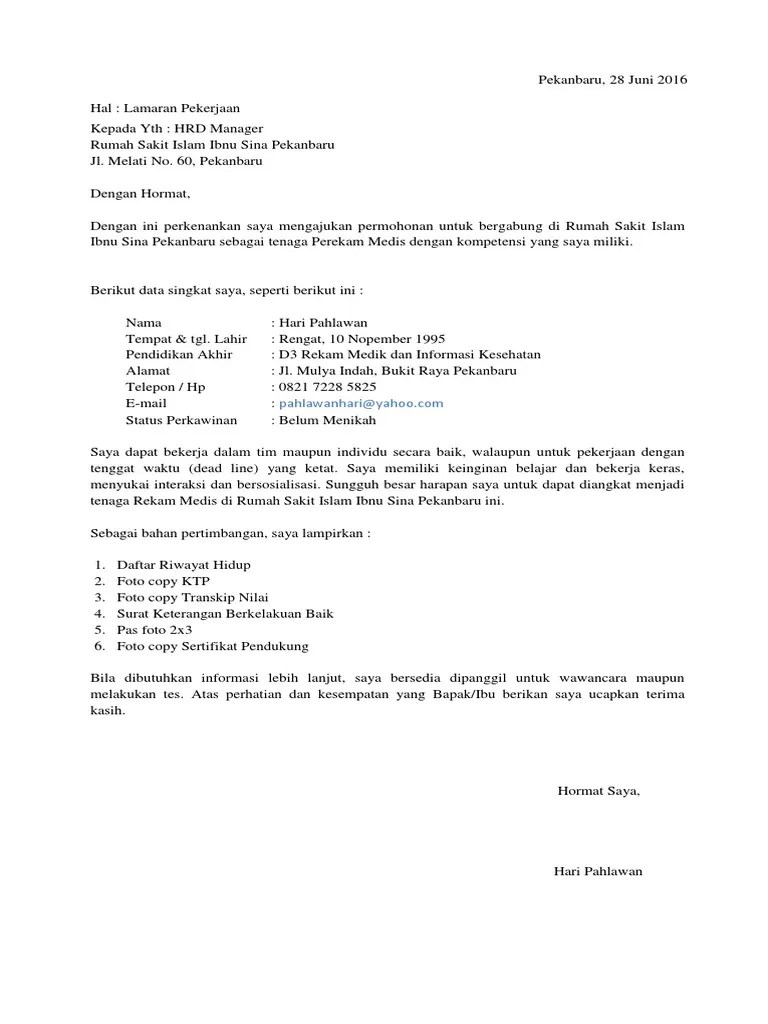 Contoh surat lamaran kerja rekam medis surat medis pimpinan.